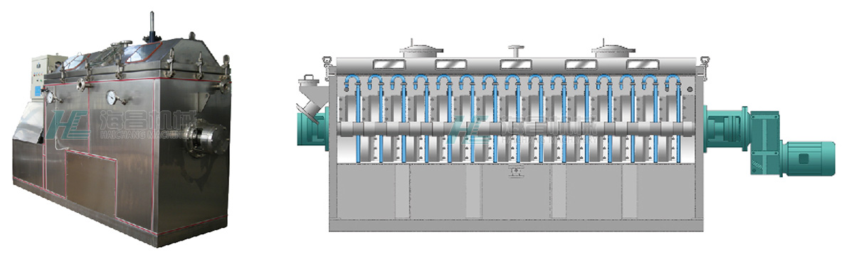 該設備采用全新的結構和工作原理,它們的主要結構如下圖所示。在一個臥式長槽形容器內組合排列了很多空心冷卻板片,中心攪拌軸從所有的冷卻板片內穿越通過,在每兩個空心冷卻板片之間安裝有阻流式分隔圓盤和很多旋輪推進刮壁式攪拌裝置,刮壁攪拌使所有的冷卻表面都起到清壁作用,使傳熱和冷卻效率大大提高。